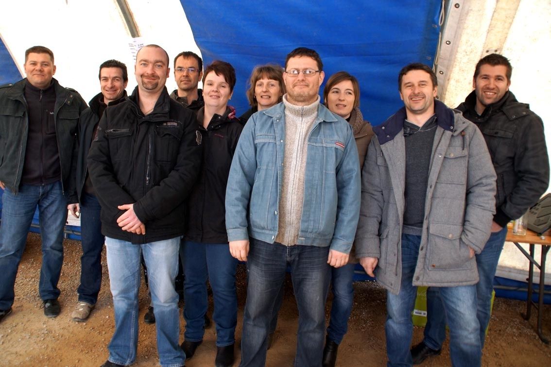 | L'équipe du président Cédric Desmaris s'est mise au travail dans la soirée de vendredi et encore ce dimanche matin dès 7h et vers 10 h elle proposait à la vente ses barquettes de tartiflette, du "fait maison" avec des produits du terroir. 120 kg de pommes de terre, don d'Alain Marguin ( Terre de France à Manziat), 25 kg d'oignons, don de Thierry Martin (CBC PRELECO |